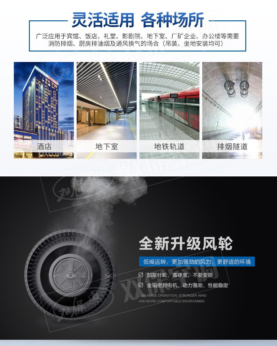 【风机特点】一机两用、噪声低、耐高温性能优良、结构新颖紧凑、振动小、重量轻、安装维护方便等