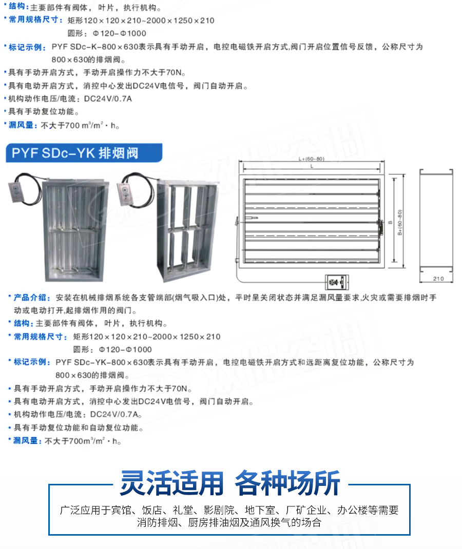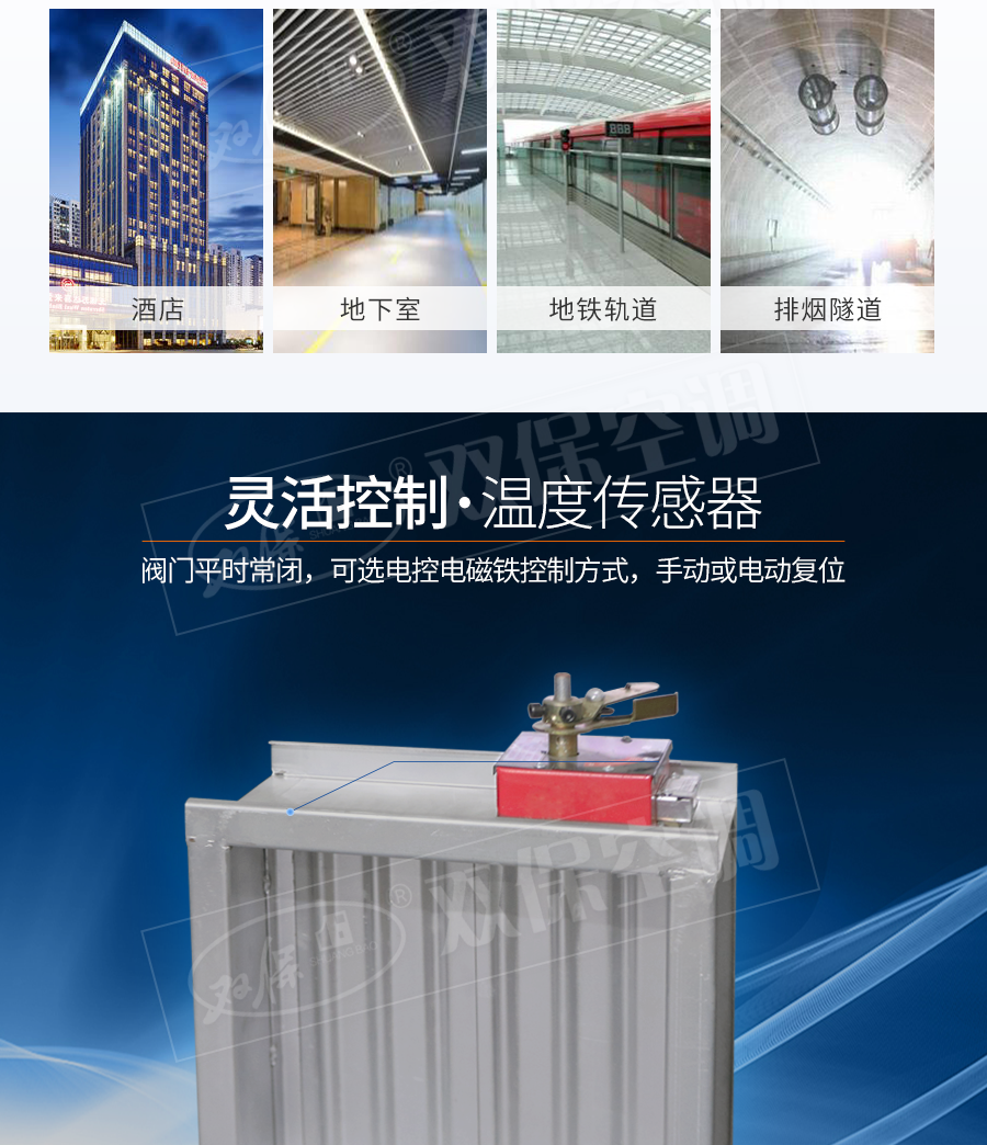江苏dafa大发空调有限公司—排烟阀 阀门平时常闭; Dc24V电动开启,手动开启,输出开启信号; 手动复位,电动复位。