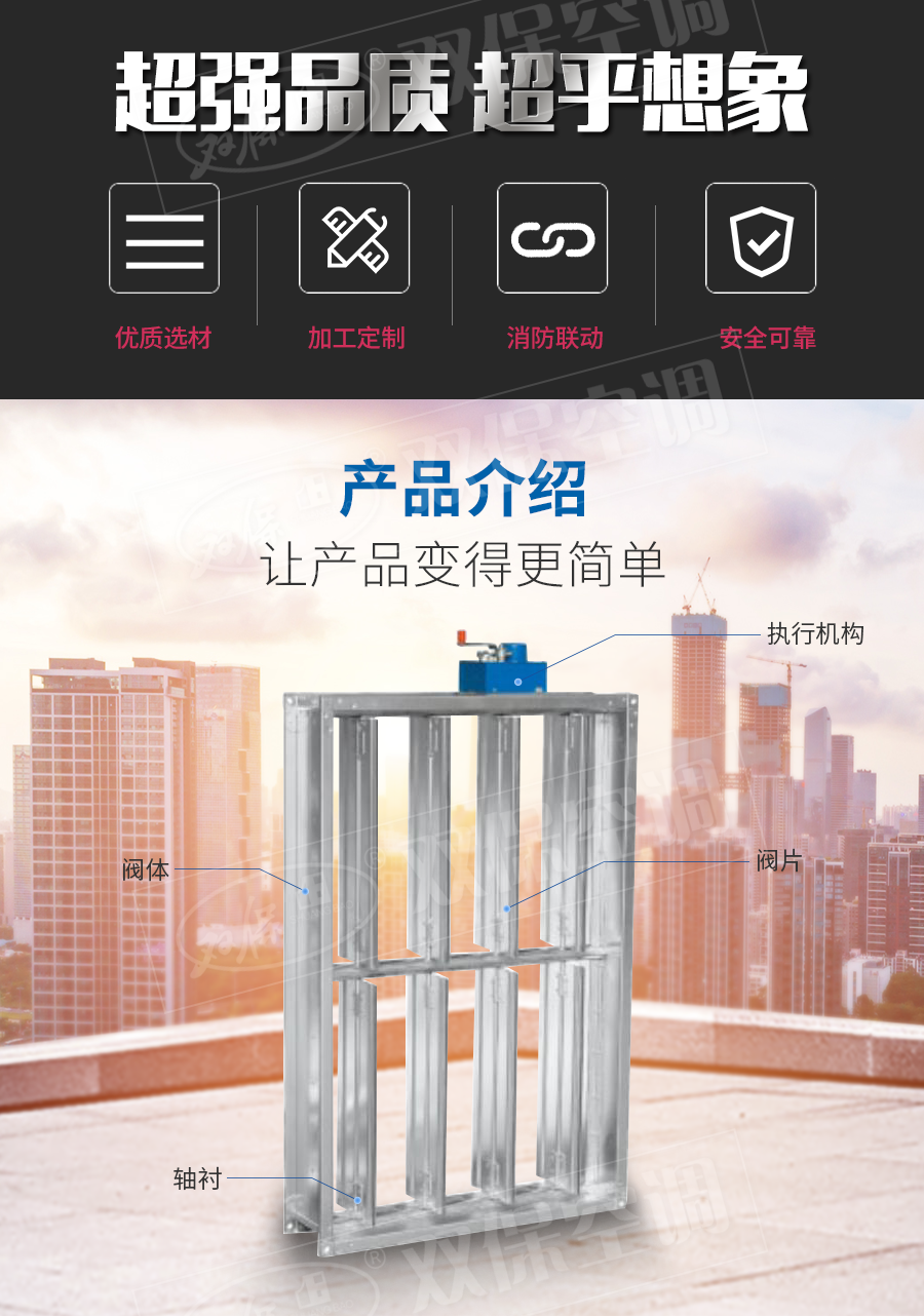 【阀门特点】CCCF认证,轻巧实用,安全可靠,寿命长久。一般安装在防烟系统管道,平时常闭,电动或手动开启。